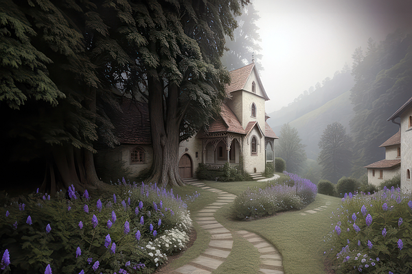 A tranquil, misty morning in a pastoral setting. A quaint, old-world cottage with a steep gabled roof and ornate detailing nestles among towering evergreen trees. A cobblestone path, flanked by lush lavender and white blooms, meanders towards the cottage, inviting a sense of wanderlust. The soft fog blankets the landscape, muting the colors and creating a gentle, dreamlike atmosphere. In the background, the silhouette of a forested hill fades into the mist, adding to the composition's serene and timeless quality.