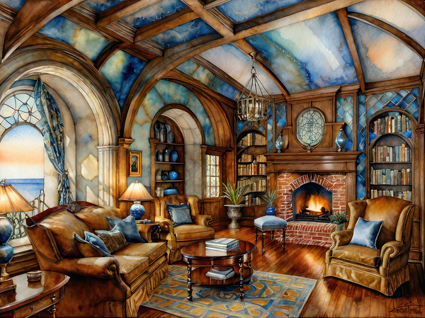 The artwork captures an inviting traditional reading room. The ceiling boasts exposed wooden beams painted with soft hues of blue and white, suggesting a cloudy sky. Arched windows allow natural light to stream in, highlighting the warm tones of the brown leather furniture. A large, ornate fireplace anchors the room, its hearth alive with dancing flames. The walls are lined with bookshelves filled with volumes of various sizes, accompanied by cobalt blue decorative vases. A wrought-iron chandelier hangs centrally, adding to the room's classic charm. The floor is adorned with a geometric-patterned rug, blending harmoniously with the wooden flooring. Watercolor style.