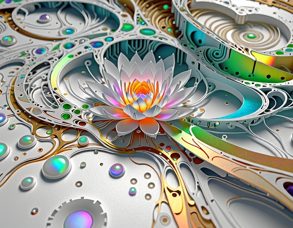 An electronic flower with an intricate design featuring metallic elements and rainbow colors, growing out of a white and gold circuit board with... more