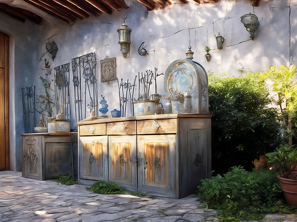An enchanting magical outdoor workspace. Distressed wooden furniture, with ornate carvings and patterns, houses an array of mysterious artifacts. Ornamental glassware, vases in shades of blue, and intricate metalwork objects rest upon the surface. Hanging lanterns and rustic wall embellishments cast a gentle glow, while verdant plants in terracotta pots add a sense of discovery and magic.