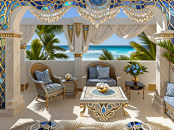 A sunny white stone porch, decorated with fringes of crystal and intricate blue and gold motifs, overlooking an inviting beach.