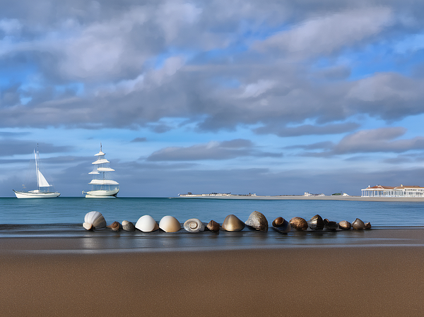 On a calm beach, an array of intricately patterned seashells are lined up as if they are gazing at two ships near the horizon.