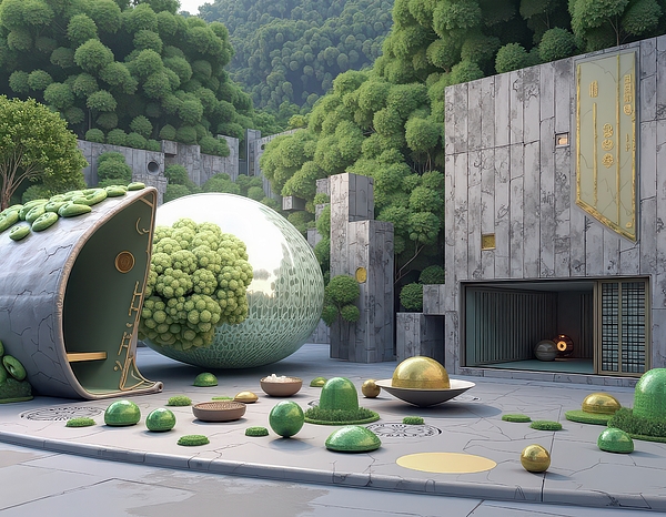 A futuristic center focusing on surrealism as therapy, using unusual grey stone spaces and objects in green and gold materials, set in a lush,... more