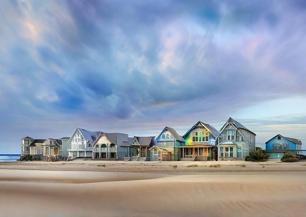 A row of beach houses lines the shore, each with its own unique architectural design and color scheme. Above them, a dramatic sky with swirling clouds adds a dynamic backdrop as the sand stretches out in the foreground.