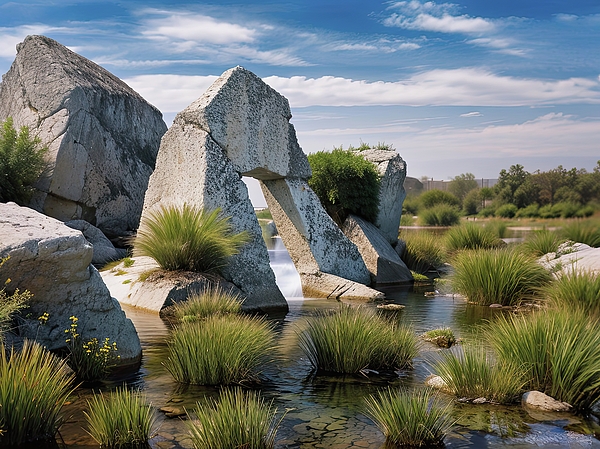 A surreal natural scene featuring large unnatural-looking geometric stone formations and lush green grasses emerging from shallow water under a blue... more